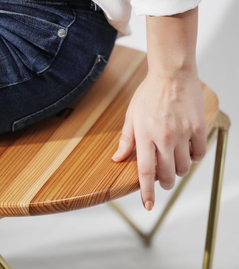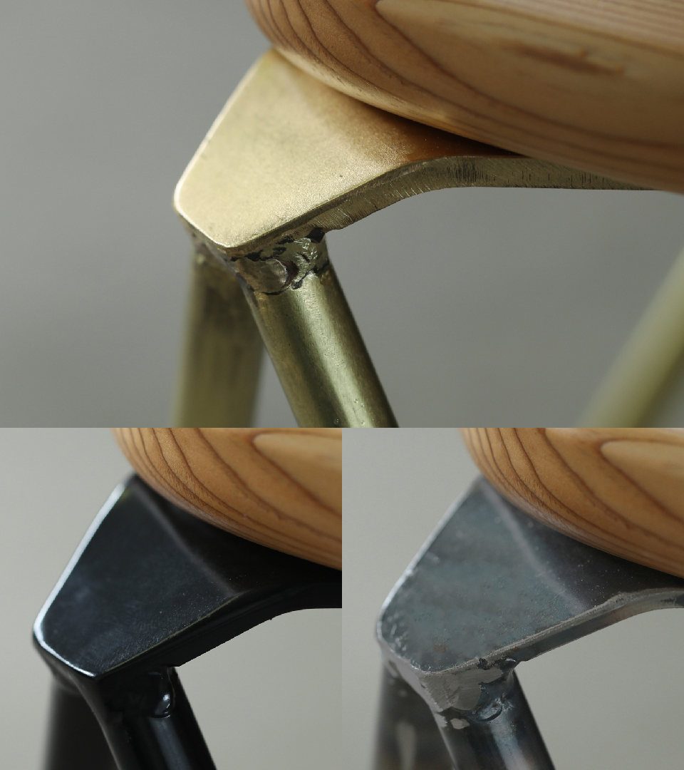 「HADA DESK」はクリア塗装鉄・黒塗装鉄・真鍮の3種類の脚部と杉の天板を組み合わせた机です。スツールと同様にそれぞれの個性を放つ溶接加工の脚部と、天然杉の奥深い味わいのマッチングをお愉しみください。